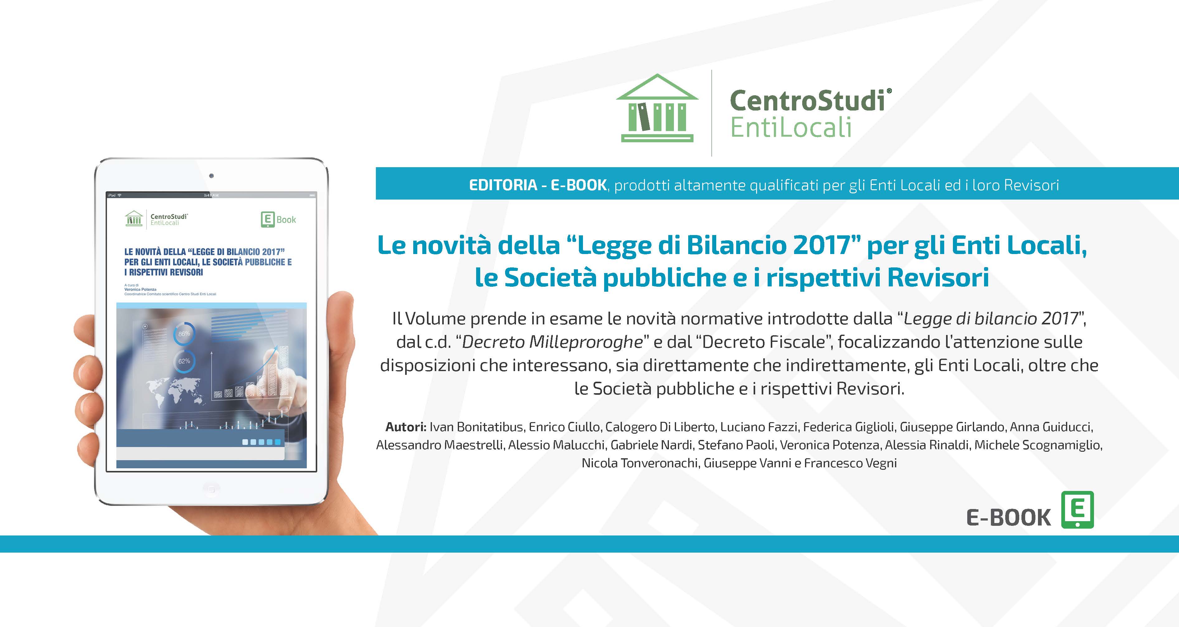 Il nuovo testo edito da Centro Studi Enti Locali prende in esame le novità normative introdotte dalla “Legge di bilancio 2017”, dal c.d. “Decreto Milleproroghe” e dal “Decreto Fiscale”, focalizzando l’attenzione sulle disposizioni che interessano, sia direttamente che indirettamente, gli Enti Locali, oltre che le Società pubbliche e i rispettivi Revisori.