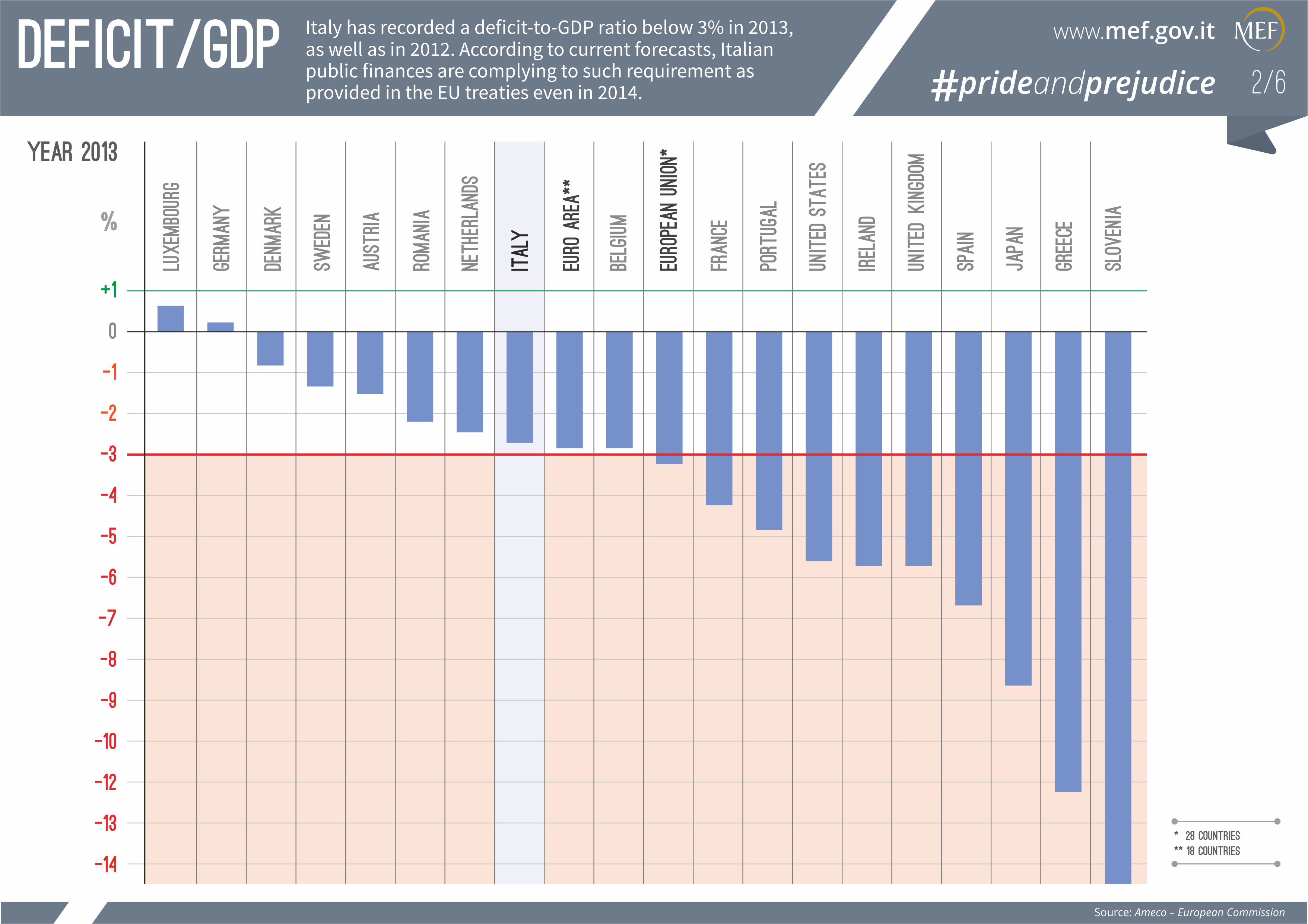 E’ il rapporto Deficit-Pil il secondo parametro scelto dal Ministero dell’Economia e delle Finanze per combattere – nell’ambito dell’iniziativa “#prideandprejudice” – i luoghi comuni che aleggiano sull’Italia, all’interno e fuori dal Paese.