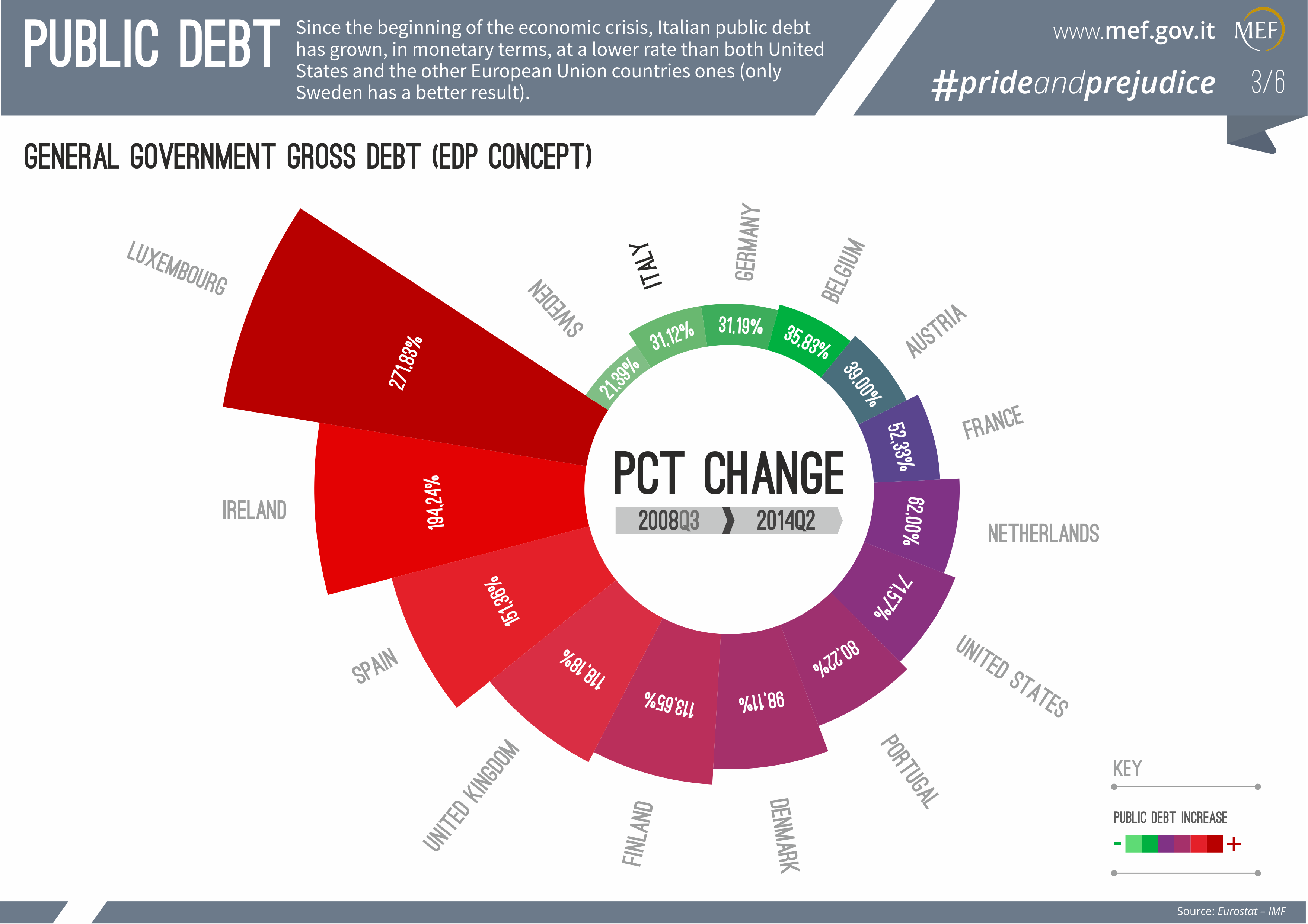 Il terzo dato macroeconomico diffuso dal Ministero dell’Economia e delle Finanze – nell’ambito della campagna “#prideandprejudice” – ha per oggetto il debito pubblico italiano. “Dall’inizio della crisi economica – fanno sapere da Via XX settembre – il debito pubblico italiano è cresciuto ad una velocità inferiore rispetto sia agli Stati Uniti che ad altri Paesi dell’Unione europea (solo la Svezia ha un risultato migliore). La dinamica del debito in termini assoluti non è necessariamente indicativa della sostenibilità del debito: il rapporto tra debito e Pil è sicuramente un indicatore più affidabile in questo senso”.